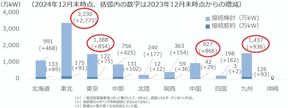 一方で、系統用蓄電池の系統接続には、現在、大きな滞りが生じている。2024年12月末時点で、接続検討受付が約9,500万kWであるのに対し、接続契約の受付まで至っている案件は約800万kW。連系済みの系統用蓄電池は、わずか約17万kWにすぎない。