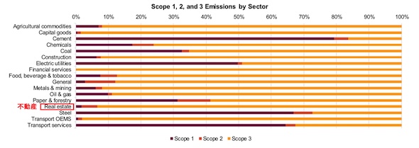 不動産業界は、バリューチェーン排出量のうち、Scope3排出量(自社での燃料や電気の使用に伴うScope1,2以外の間接排出量)が多い業界の一つであり、建築資材や施工などアップフロントカーボンの削減に向けた取り組み状況の開示が重要である。