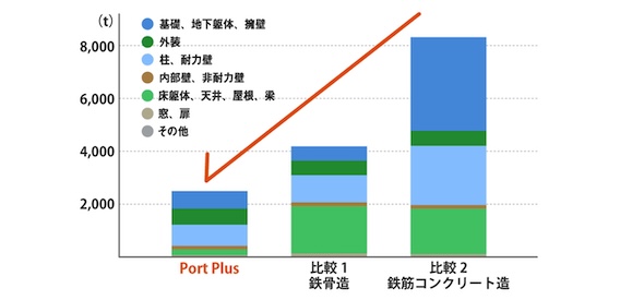 大林組の11階建て研修施設「Port Plus」では、1,990m3の木材を使用したことにより、約1,652tのCO2を固定しており、そのアップフロントカーボンは一般的な鉄骨造と比べ、約1,700t削減したと試算している。