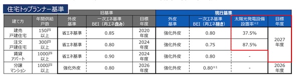 これまで住宅トップランナー制度では、一定規模以上の事業者に対して、一定の省エネ基準の達成を求めてきたが、国土交通省はトップランナー基準として、新たに太陽光発電設備設置率を加えることとした。新たな基準は2027年度を目標年度として、建売戸建住宅では37.5%、注文戸建住宅では87.5%としている。
