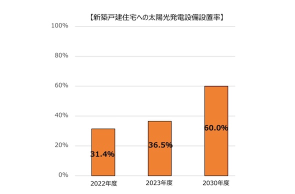 第6次・第7次エネ基では、2050年には太陽光発電設備の設置が合理的な住宅・建築物の100%、2030年には新築戸建住宅の60%への設置を目標としており、これによる設備容量は3.5GWとなる。2023年度の新築戸建住宅の太陽光発電設備設置率は36.5%まで上昇している。
