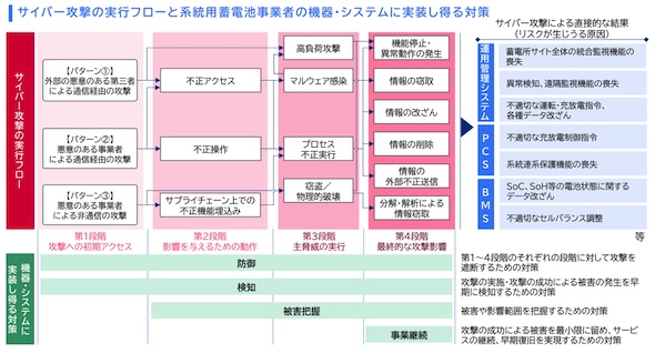 蓄電所に対するサイバー攻撃は、図4のように、4つの段階を経て実行されるため、それぞれの段階に応じた「防御」や「検知」等の対策をあらかじめ機器・システムに具備しておくことが重要となる。