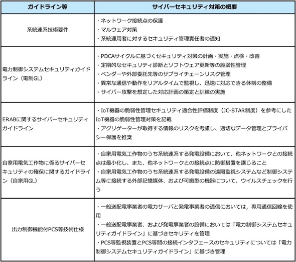 また、一般送配電事業者各社が定める「系統連系技術要件」では、ネットワーク接続点の保護、マルウェア対策、系統運用者に対するセキュリティ管理責任者の通知、の3点が求められている。
