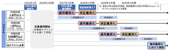 以上の議論を踏まえ、SSBJ基準の適用はプライム市場上場企業を対象として、企業等の準備期間を考慮し、以下の時期からの適用開始を基本とする。