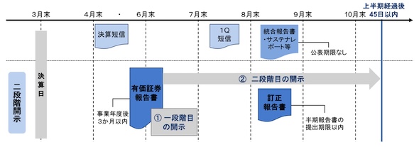 サステナビリティ関連財務開示は、関連する財務諸表と同時に報告することが原則であるが、ISSB基準においては適用初年度の経過措置として、「二段階開示」が認められている。