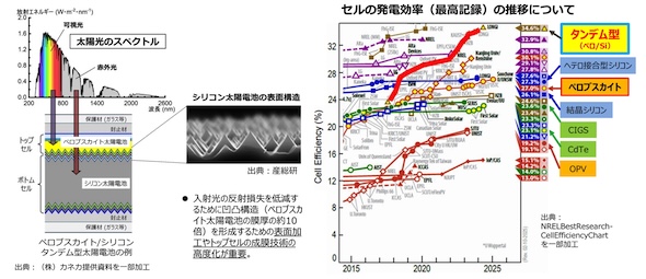 タンデム型太陽電池とは、太陽光の異なる波長を吸収する、異なる材料を積層させることにより、従来のシリコン太陽電池と比べると変換効率が1.5〜2倍程度向上する次世代型太陽電池の一つである。同じ設置面積から、より多くの電力が得られるため、新規設置だけでなく、既設のシリコン太陽電池からのリプレース需要も期待されている。