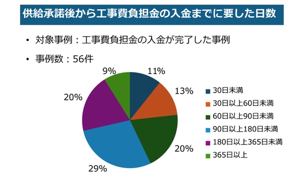 また、供給承諾の後、DCが工事費負担金の入金までに要した日数としては、約4割が3カ月以内に入金しているものの、半年以上を要した事例(約2割)や1年以上を要した事例(約1割)もあった。ただし現行の運用では、供給開始時期から逆算して入金を促しているため、供給開始時期まで余裕のある案件では、日数が長い=遅延とは限らないことに留意が必要である。