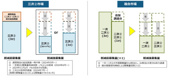 このため、2026年度以降の複合市場における募集量削減策としては、制度運用を統一する観点から、一次〜三次①の全ての商品で、市場による調達量を最大1σ相当とすることとした。一次・二次①は、必要量3σとの差分は余力活用にて調達し、二次②・三次①は、これまでどおり前日12時の広域予備率が閾値を下回っていれば、不足分を余力活用にて追加調達する。