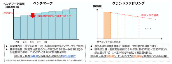 本制度では対象事業者に対して、毎年度の排出実績と同量の「排出枠」を保有することを義務づけており、排出枠の割当は「ベンチマーク方式」又は「グランドファザリング方式」のいずれかにより行うこととしている。
