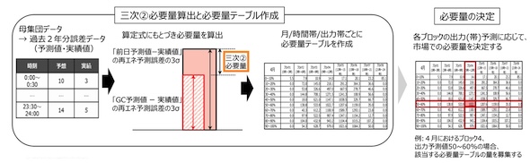 これまでは、出力帯別予測誤差の過去最大相当である「3σ相当値」を算出して、事前に三次②必要量テーブルを作成し、翌日の各ブロックにおける出力予測量(日射量予測)に応じて、三次②必要量テーブルの出力帯の値を選択することで、日々の必要量を決定していた。