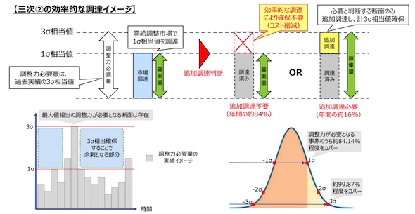 ただし、三次②価格高騰発生後の2024年7月以降、応札不足対策の一つとして「効率的な調達」を開始し、再エネ予測値が大きく下振れした場合は「余力活用」により追加調達することを前提として、市場での調達量を「1σ相当値」に減らす取り組みを行っている。