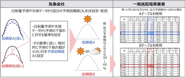 気象会社はアンサンブル予報に基づく日射量の「信頼度階級予測」として2種類(高 (A)、低 (B))を設定する。一般送配電事業者は、その信頼度階級予測をもとに過去の再エネ予測誤差実績を2種類に分け、2つの三次②必要量テーブル(Aテーブル・Bテーブル)を作成しておき、翌日の信頼度階級予測によって、必要量テーブルを使い分ける手法である。