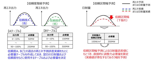 先述の現行手法「信頼度階級予測」では、過去の再エネ予測誤差実績をベースとした2つのテーブルをあらかじめ作成しておき、翌日の日射量予測と予測の信頼度階級によって、日ごとに使い分けている。