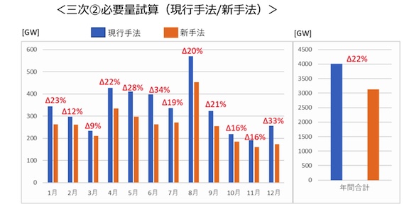 そこで、「信頼度階級予測」と「信頼区間幅予測」を併用し、それぞれ算定される三次②必要量のうち、小さい方を当該コマの三次②必要量として採用する「新手法」について、その効果の検証が行われた。一定の前提条件のもとで、同じく中部エリアに新手法を導入したと仮定した場合、現行手法と比べ、三次②必要量は年間合計で約22%、約878GW低減する試算結果となった。
