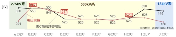 しかしながら近年、一部のエリア・系統では、再エネ電源や需要家設備等が原因となり、「電圧」に起因した系統の安定運用への影響が出始めている。基幹系統における軽負荷期の電圧は、全国10エリアのうち3エリアで「JEC最高許容電圧(系統でまれに発生することのある最高限度の電圧であり、電線やがいし等の絶縁設計に使用される電圧値)」を一時的に超過している。