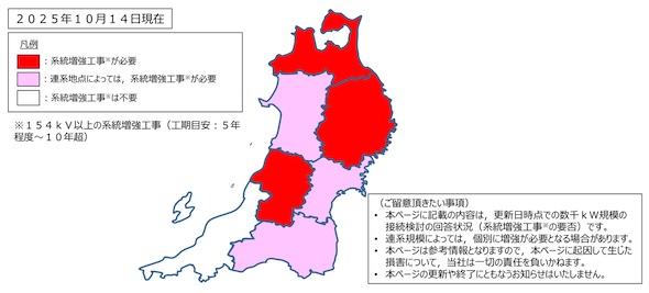 「系統増強工事が必要」とされた県で系統接続できないわけではないが、154kV以上の系統増強に要する工期は一般的に5〜10年以上であるため、蓄電池等の事業者は立地選定の参考情報とすることができる。他エリアでも同様の情報公開が進むことが期待される。