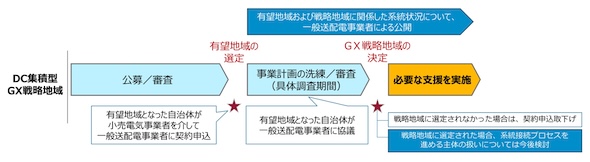 「DC集積型GX戦略地域」の選定プロセスとしては、国は自治体から提出された計画を踏まえ、まず「有望地域」を選定し、各種インフラ整備やDC誘致等の計画が優れた自治体を「GX戦略地域」に認定するという2段階の審査が予定されている。