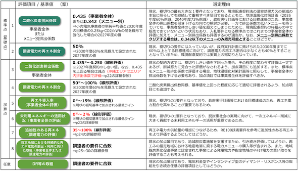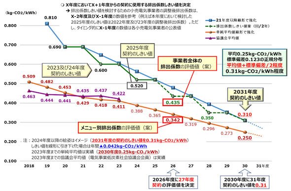 現在のしきい値は、事業者の予見性確保の観点から、「第6次」エネルギー基本計画・エネルギーミックスでは2030年度の国全体のCO2排出係数を0.25kg-CO2/kWhと想定していることを踏まえ、2030年度(2031年度契約)のしきい値0.310に向けて、ほぼ直線的に引き下げていく方向性が示されている。