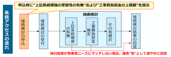 現状の仕組みでは、系統用蓄電池事業者が接続検討を申し込むと、一般送配電事業者は系統接続に係る対策工事等を詳細に検討し、工事内容や所要工期、工事費負担金等をセットで3カ月以内に回答を行っている。その回答を受領した蓄電池事業者は、工期や負担金等が自社の事業計画・採算性にマッチしない場合、その事業化を断念し、接続契約申込みに進まないこととなる。