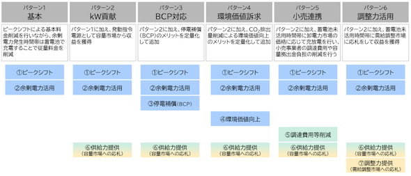 蓄電池の導入により、ピークシフトによる設置者(需要家)自身の基本料金削減が可能となるなど、さまざまな経済的価値が得られるが、このようなユースケースの組合せで想定されるマルチユースのパターンとして以下の6つが想定された。