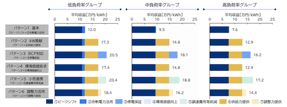 図4の通り、ユースケースのうち、ピークシフト(基本料金削減)による経済的効果が最も大きい点はいずれのパターンも共通であるが、ユースケースを積み重ねることにより、収益が2倍程度大きくなるパターンもある。また負荷率の違いにより、ピークシフト効果の大小が異なるため、低負荷率グループの収益性が高いことが確認された。