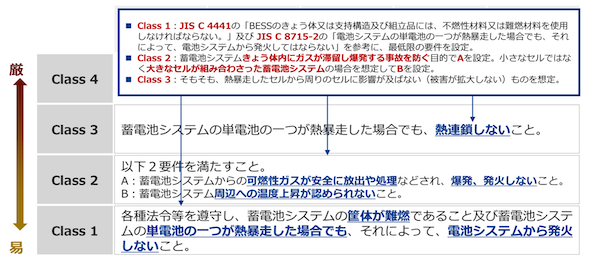 このため経済産業省は、「電気設備の技術基準の解釈(20130215保局第4号)」を改正し、JIS C 8715-2(2024)を引用することで、電気事業法上の技術基準を明確化した(2025年11月施行)。また系統用蓄電池や、発電所に併設される電力貯蔵装置等を、電気事業法上の事故報告の対象に追加した(2025年11月施行)。