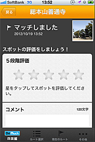 ドリマッチの画面。四国の名所を案内してくれるアプリで、目的地に近づくと「マッチ!!」ボタンが登場する。ボタンを押せば「マッチしました」という表示がでてきて、オススメポイントを評価したり、写真をSNS(Twitter、Facebook、mixi)で共有することができるT嬢のご機嫌がかなり斜めになってしまった。こんなときには、おいしいモノを食べさせるのが一番である。地元の人に聞いてみたものの、「う〜ん、知らないねえ」といった返事。困ってしまった。このままでは彼女の機嫌は、ますます悪くなるばかり。ある人は「納経所の人だったら、知ってるかも」と言っていたので、聞いてみることに。