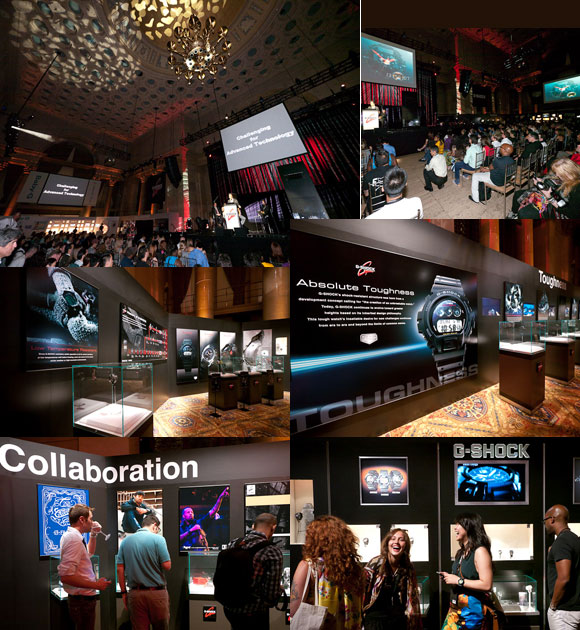 カンファレンスはプレス関係者やG-SHOCKファンでほぼ満席(上)。G-SHOCKの歴史や特徴を紹介した会場(中)。“Collaboration”コーナーでは、アーティストらとのコラボモデルを展示。ほとんどの来場者の腕にはG-SHOCKが光る(下)
