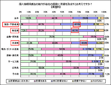 しかし業種別に結果を見ると、影響度合いが大きいと答えたのが金融・保険業の75.0%、公務員の50.0%だったのに対し、製造業の46.1%、建設不動産業の40.0%、流通業の30.0%は「特に影響はない」と回答しており、業種によって認識に違いがあった。
